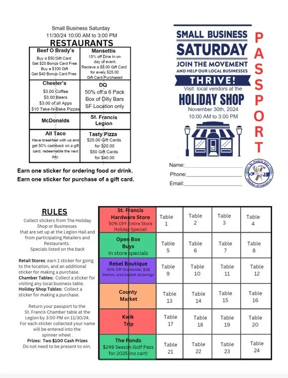 The St. Francis Area Chamber of Commerce would like to help promote local businesses this holiday season. We will be sponsoring a Shop Local Passport Event on Small Business Saturday, November 30th. This is a one-day event only! There will be an opportunity for two lucky shoppers to win a total of $200 (2 $100 winners) for participating in this event.